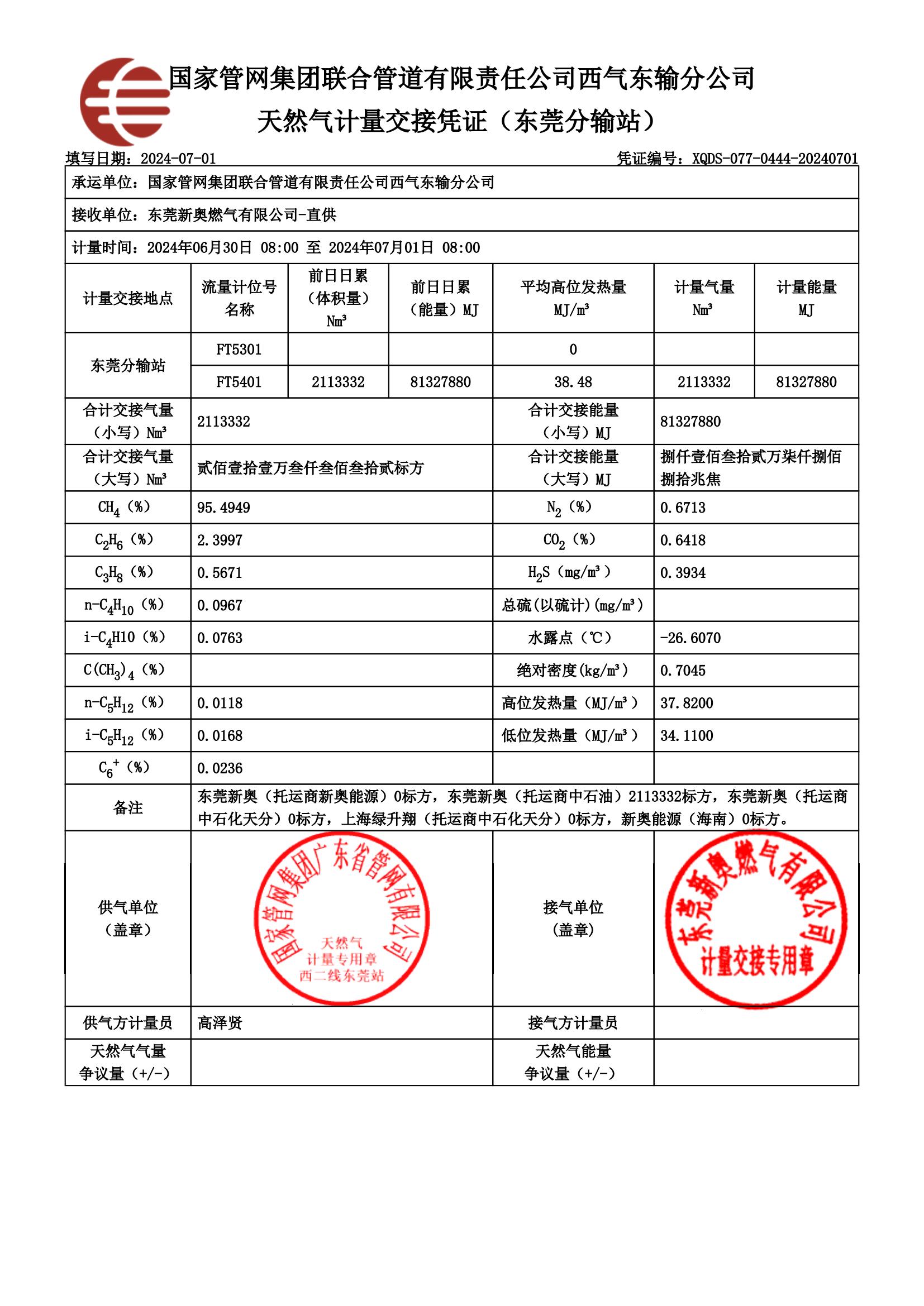 東莞新奧燃氣2024年7月份供氣質量檢查報告公示