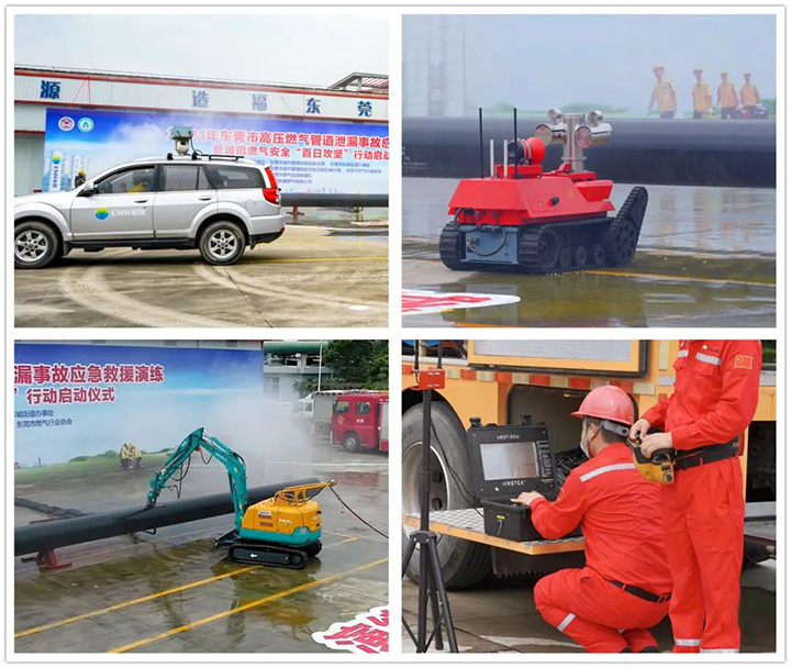 演練期間運用了多種新型遠程操作設備。如甲烷激光檢測車和手持激光監測儀,可遠程檢測50米外燃氣泄漏;事故現場探測機器人集視頻監控、圖像采集、遠程對講、紅外觀測、智能遙控、氣體濃度檢測等功能,適用于人體不適宜進入的復雜環境和存在易燃易爆氣體環境中進行實時檢測;遠程遙控封堵機器人可攜帶不同堵漏工具進入事故現場搶修,同時具有挖掘清障和吊裝功能。這些自動化智能搶修裝備亮相可取代人工完成各類搶修的同時,為搶險隊伍科學制定搶險方案提供依據,降低施工風險,提高搶修效率,進一步提升了搶修工作的智能化程度。